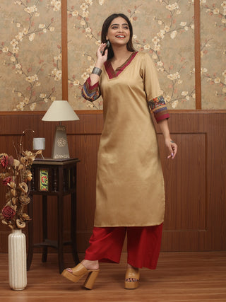 Rust Red Cambric Cotton Kurti with Banarasi Yoke Accented By Embroidery