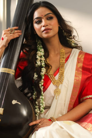 Antique Gold Tissue Silk Saree with Red Hand Aari And Black Brocade Border