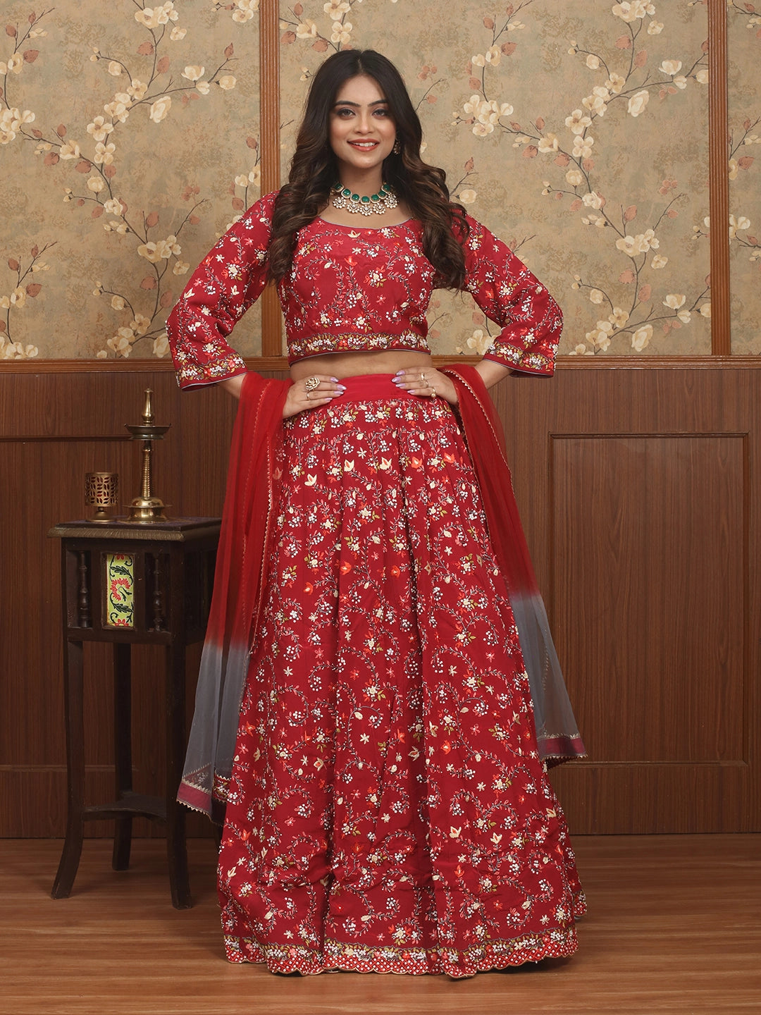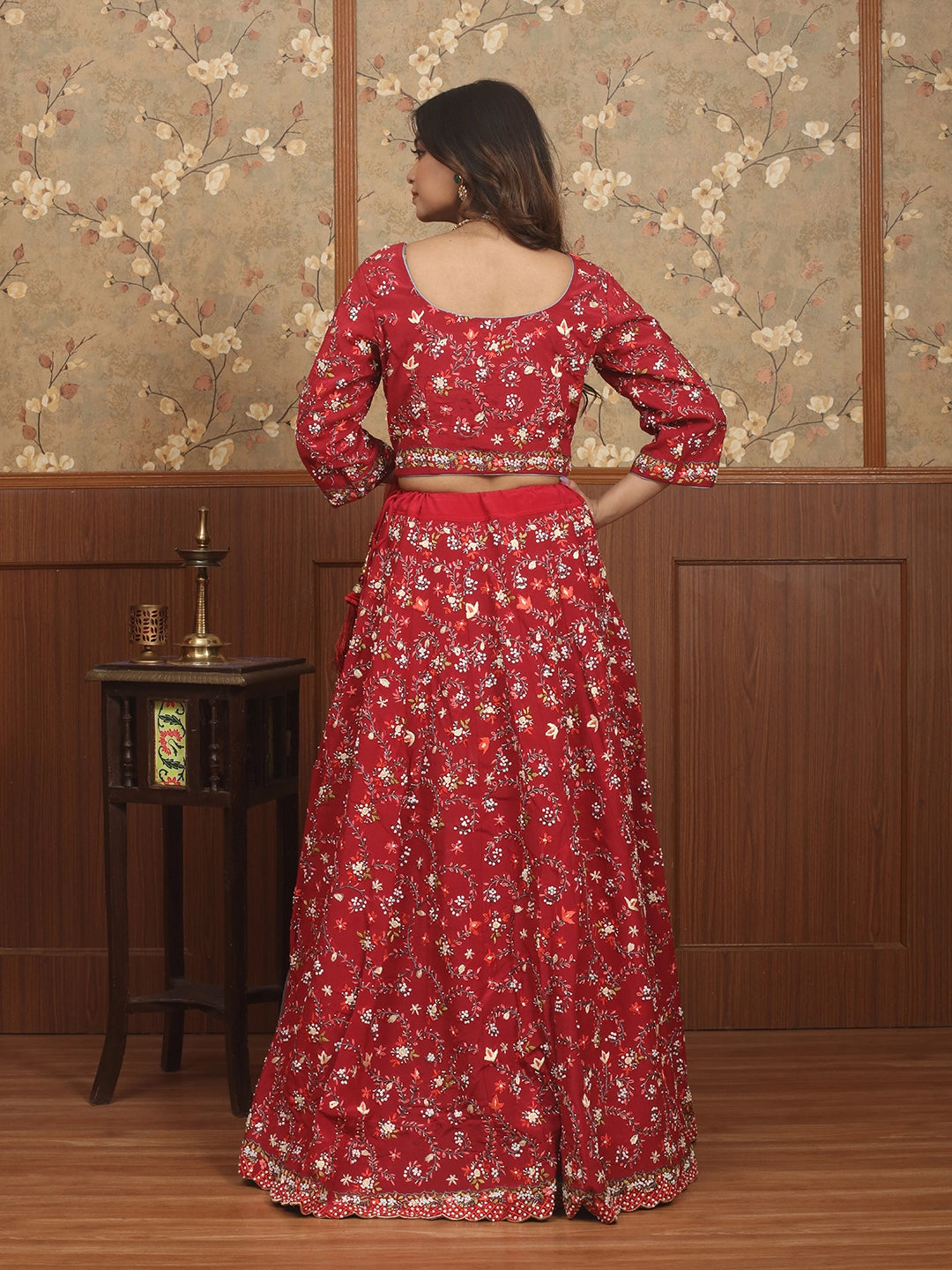 Vibrant and festive, this crimson crepe silk lehenga-choli set showcases exquisite Parsi-inspired hand embroidery with bead, sequins, and cutdana highlights.