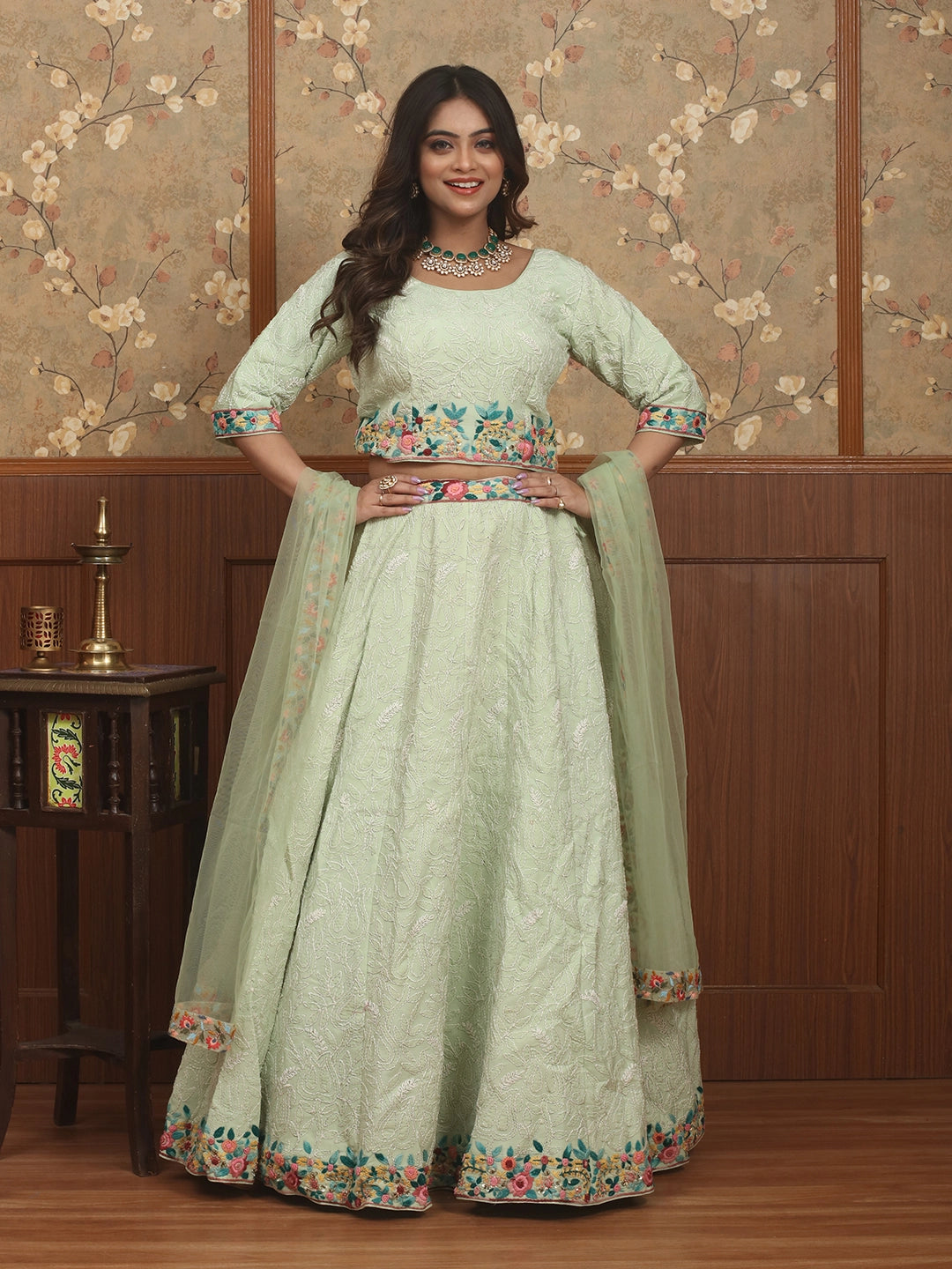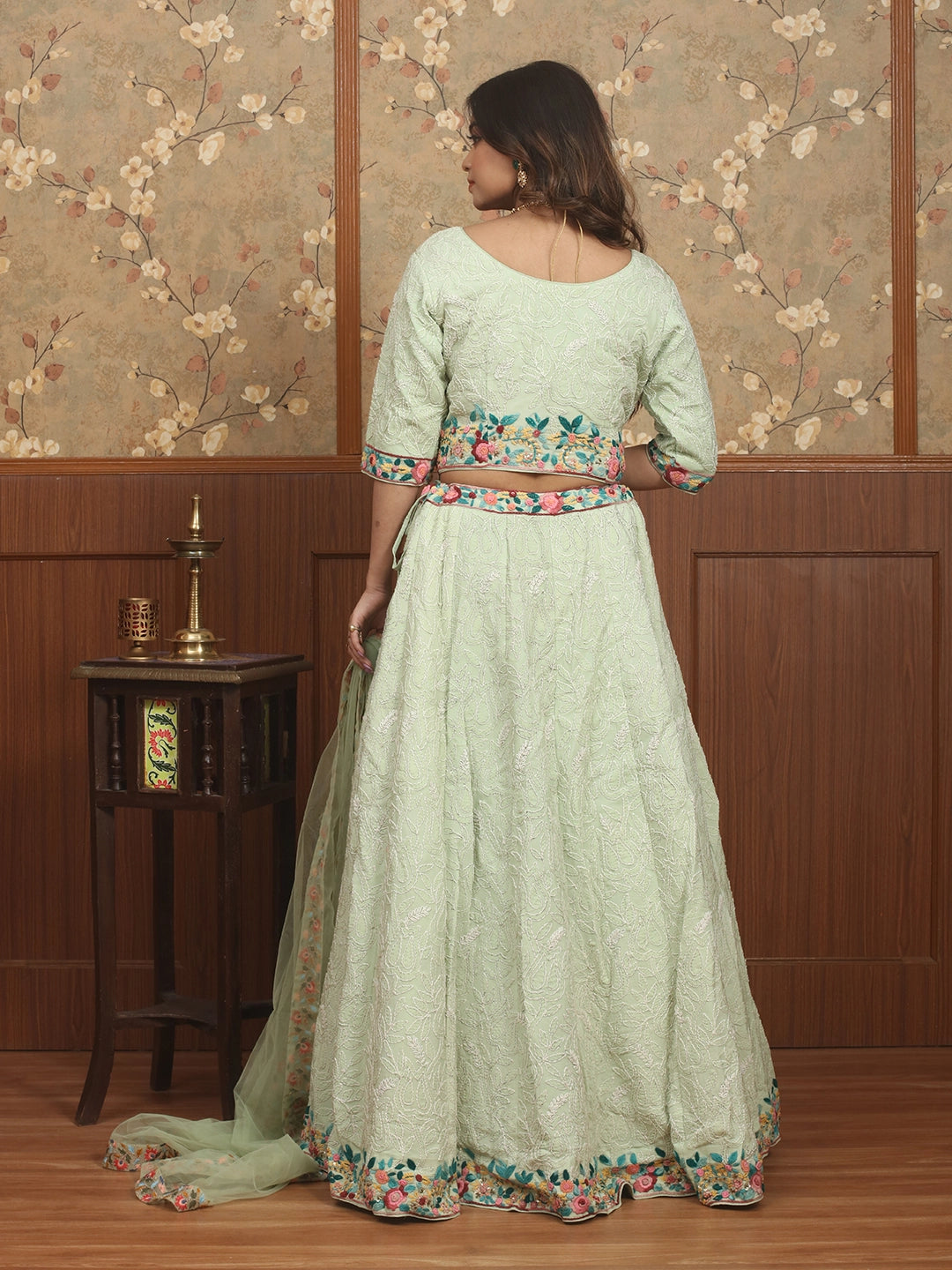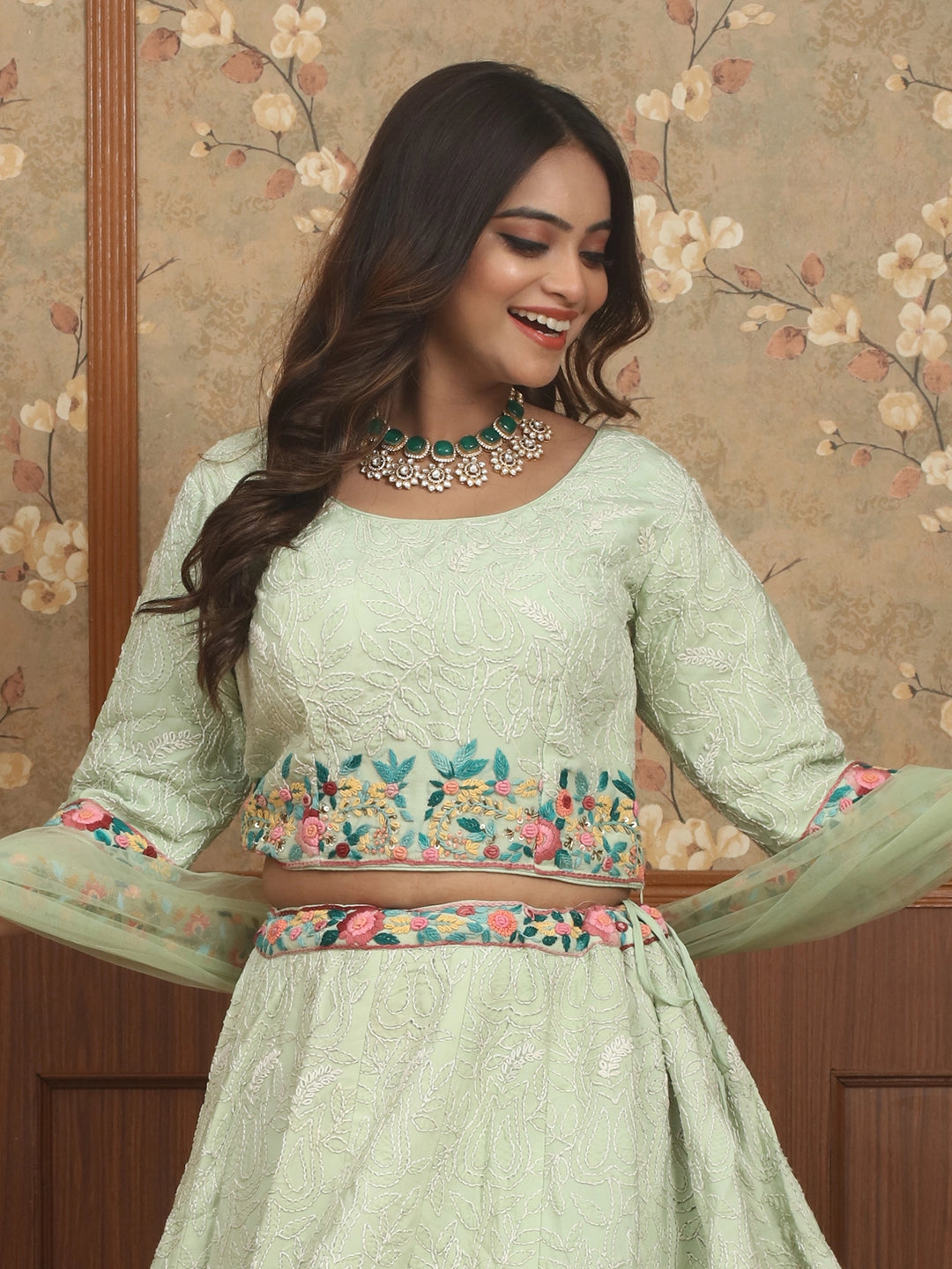 A stunning mint green crepe silk lehenga-choli set featuring a fusion of Lucknowi chikankari with Parsi embroidery inspired hand embroidery. Highlighted with sequins and beads, and paired with a net dupatta with intricate embroidered borders, this creation blends grace and luxury flawlessly.