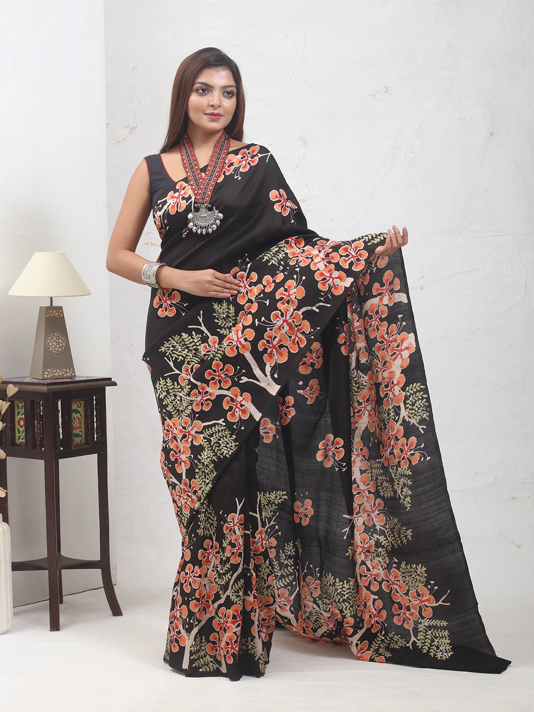 Black Pure Bishnupur Katan Silk with Gulmohar Flowers in Hand Batik