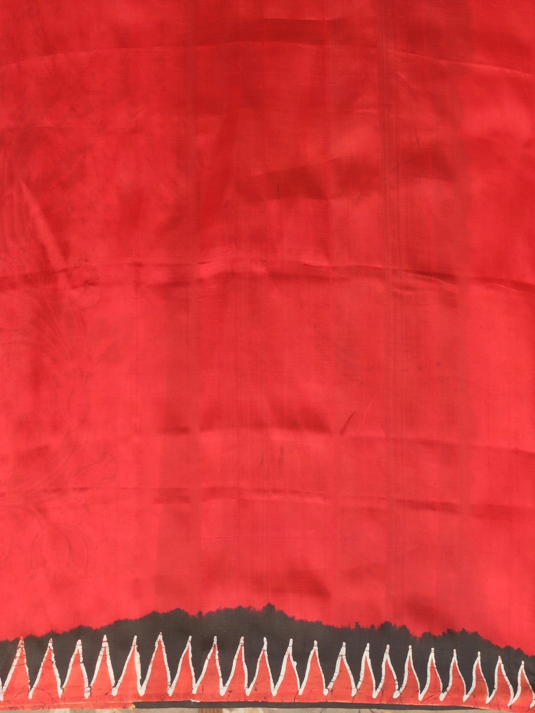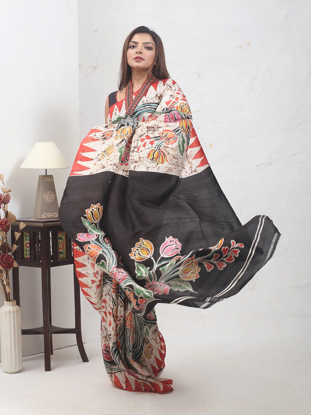 A striking creation combining cream, black, and red in classic Batik artistry. Floral bursts and geometric accents merge beautifully, embodying the dramatic flair of hand-batik silk from Bengal.