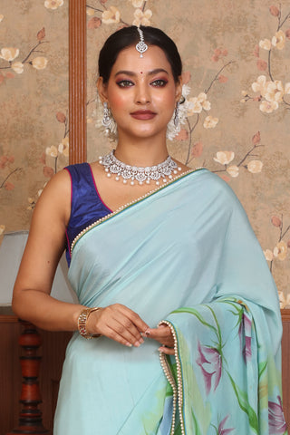 Aqua Blue Chinnon Silk Saree with Intricate Embroidery & Antique Gold Border