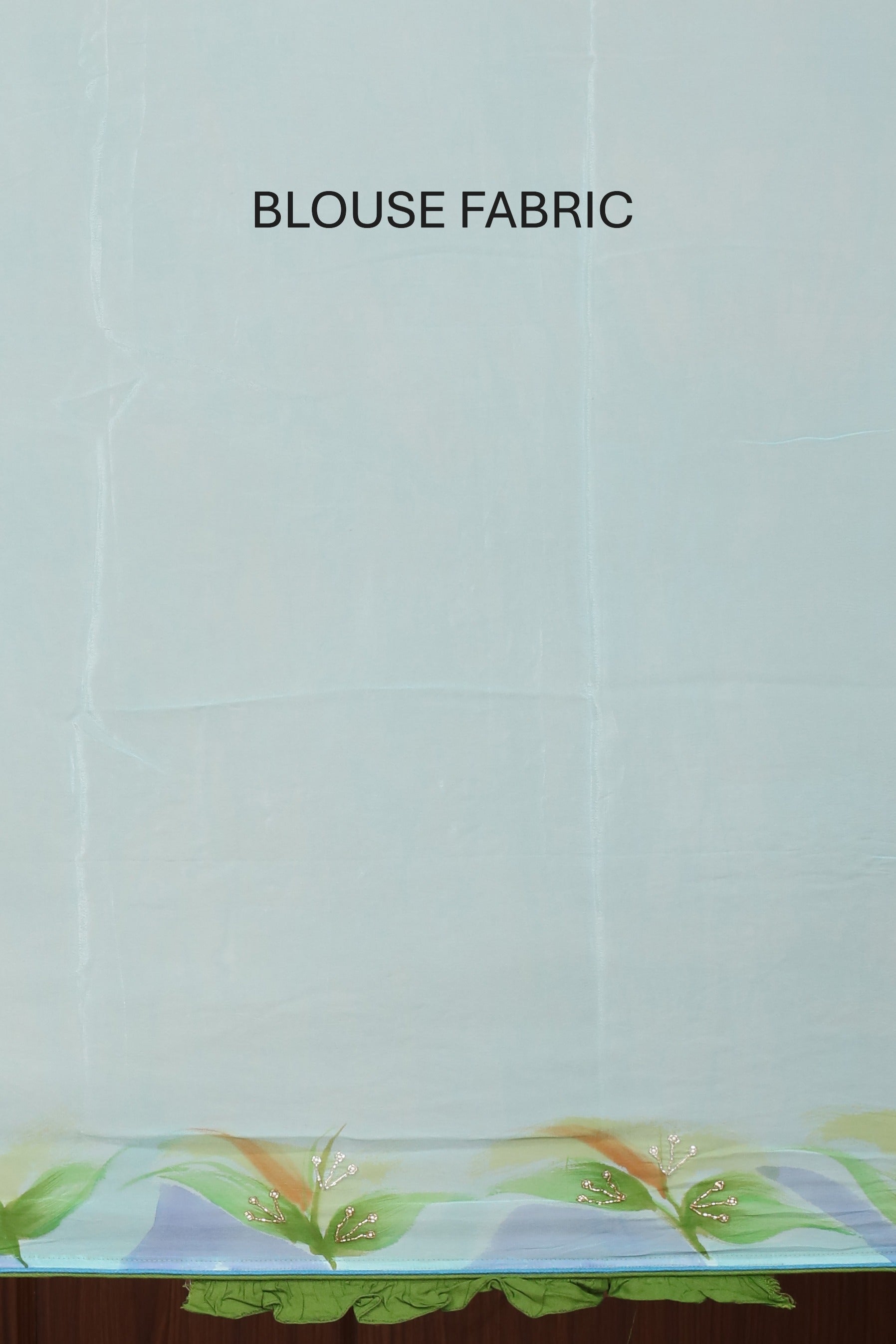 A refined pearl border with piped finishing adds an elegant touch, ensuring a sophisticated drape. Paired with a hand-painted blouse with frilled sleeves, this saree offers a contemporary yet timeless charm, perfect for festive and ceremonial occasions.