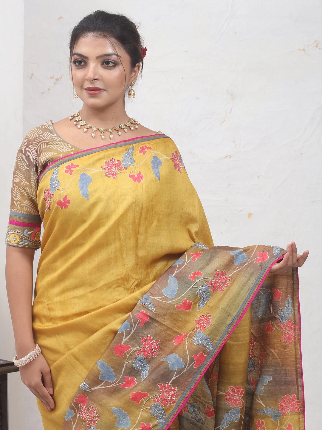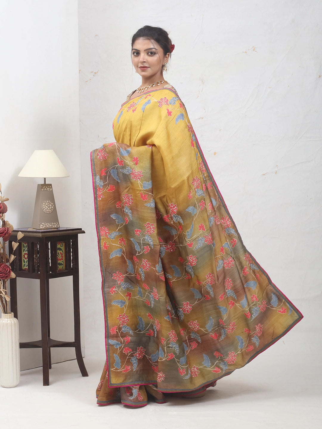 Drape yourself in art with this mustard yellow tussar silk saree, detailed with screen-printed floral motifs and hand aari embroidery highlights. The contrasting pallu showcases a deeper earthy palette, adding dimension to its traditional charm.