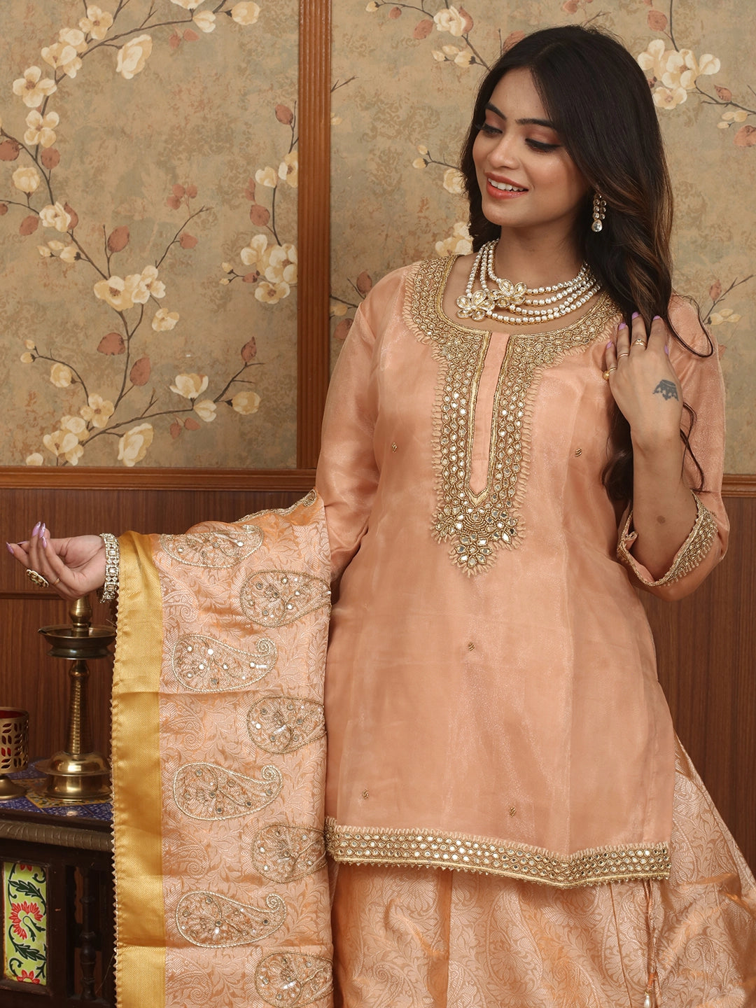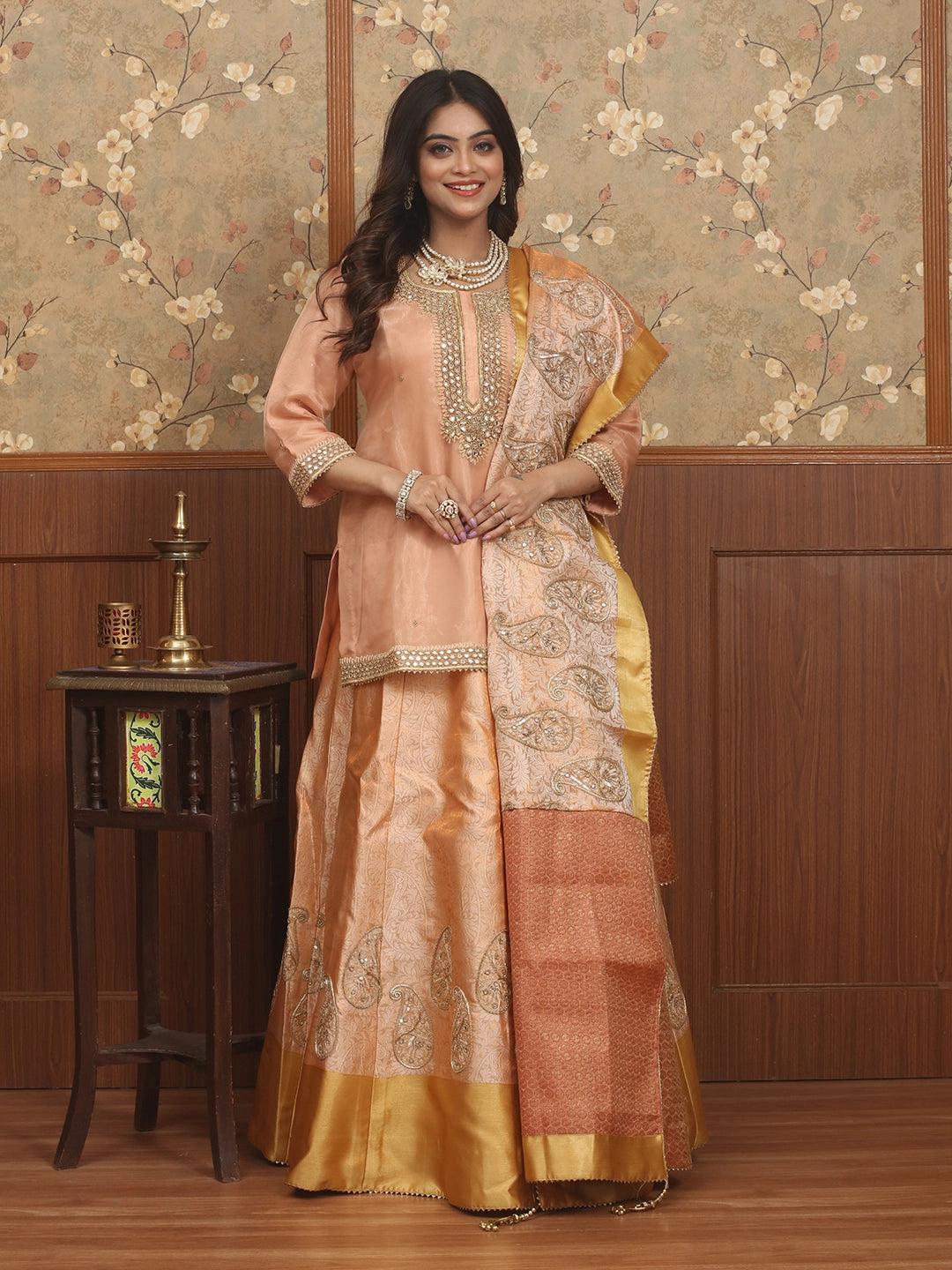 Peach Gold Semi-Katan Banarasi Lehenga And Peach Organza Blouse With Zardozi Work
