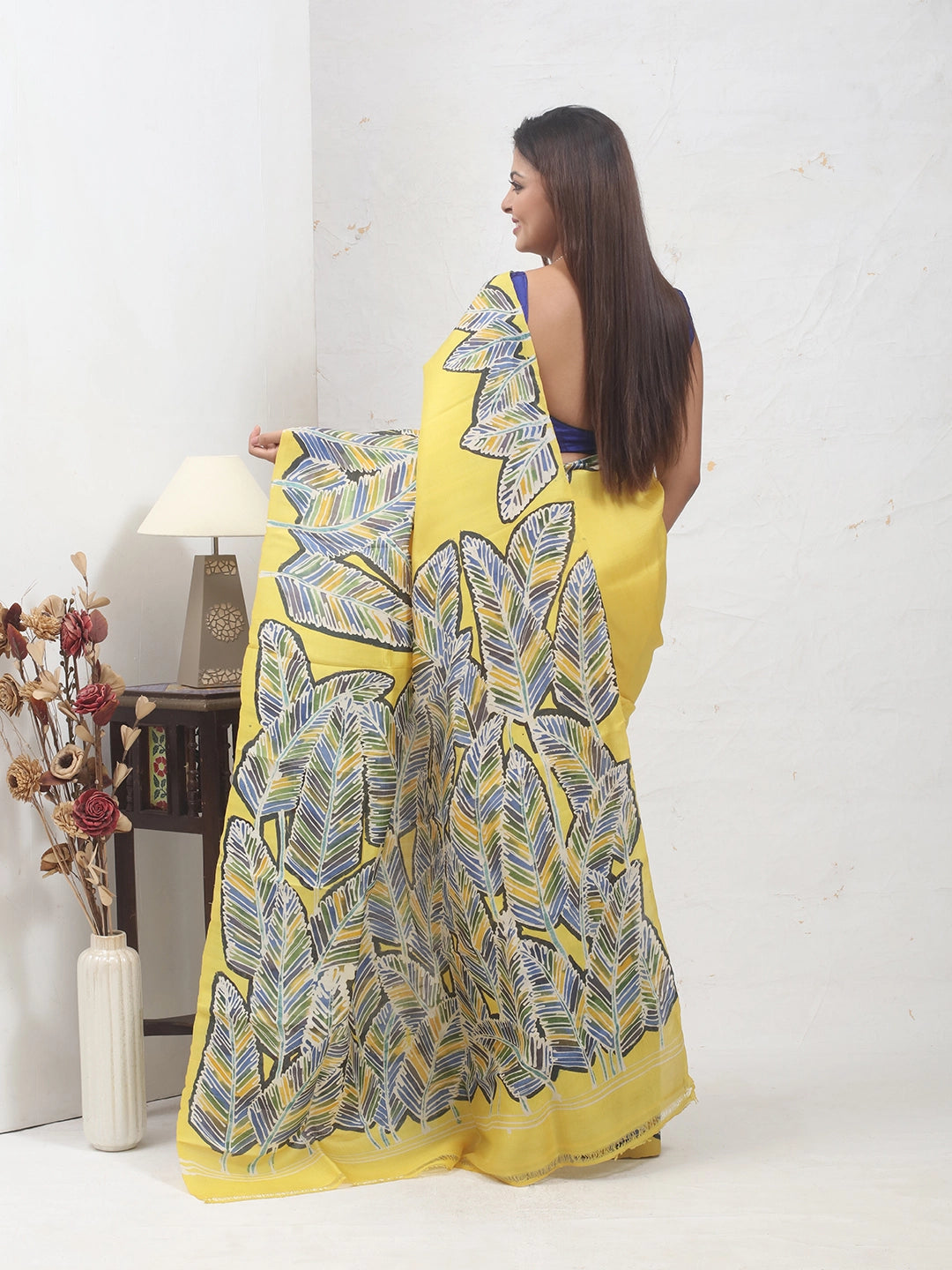 Bright and lively, this sunshine-yellow pure Bishnupur katan silk saree features contemporary feather motifs in hand Batik in indigo, olive, mustard and grey tones. Its lightweight silk drape and joyful palette make it perfect for daytime festivities.